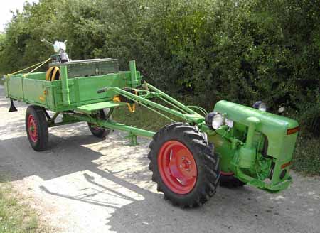 Hallo, hier sind zwei Bilder von meinem Holder. Ich habe ihn jetzt seit etwas über 3 Monaten, und Freitag die Restaurierung beendet. Die beschränkte sich bei der Zugmaschine auf Säubern, neu Lackieren, neu bereifen und Wechseln der Betriebsflüssigkeiten. Am Hänger gab es mehr zu tun (die Bremse war hinüber, die Achslager schwergängig, viel Rost usw.). Außerdem war die komplette Elektrik marode, so dass ich alle Leuchten am Hänger tauschen musste und neue Kabel verlegen musste. Habe dann auch noch gleich Blinker nachgerüstet (das Relais, Schalter und die Stromverteilung sind in der schwarzen Kiste auf der Fahrersitzbank untergebracht, die Batterie ist vorübergehend auf der Ladefläche). Zu den techn. Daten: ED 10, Baujahr 1952 10 PS ventilloser zweitakt Holder-Diesel Höchstgeschwindigkeit 8 km/h Hänger: Eigenbau, Baujahr 1952 Wurde von einem Schlosser gebaut, der hauptberuflich als ziviler Schlosser auf einem Flugplatz der US Air Force in Unterfranken angestellt war (vermutlich aus US-Restteilen; die Reifen waren auf jeden Fall US Militär - Fabrikat) War damals der erste Holder in Obernbreit (Lkr. Kitzingen), wo ich ihn auch her habe. Wurde damals im Ort "Die Kuh aus Eisen" genannt - es gab sogar Bilder von diesem Holder, der ihn mit Hänger und Feldküche bei einem Faschingsumzug Ende der 5oer zeigt mit einem großen Schild "Die Kuh aus Eisen". Lieder konnte der ehemalige Besitzer die Bilder nicht mehr finden. Grüße |
